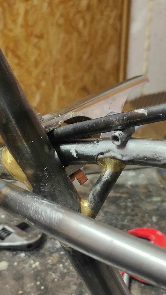 The bridges on the rear triangle were designed by directly joining the chainstays and seatstays to the seat tube with leftover cutouts from those same tubes, and also the two reinforcements, one on the head tube and one on the top of the seat tube, have been made from the leftover tubes from the bent and oval chainstays. aiming for a more refined, functional, and let’s say, sustainable touch.